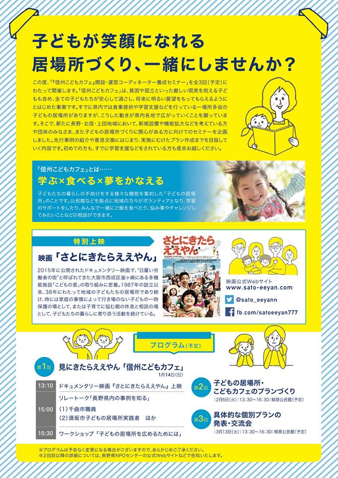 そこで、新たに長野・北信・上田地域において、新規設置や機能拡大などを考えている方や団体のみなさま、また子どもの居場所づくりに関心がある方に向けてのセミナーを企画しました。