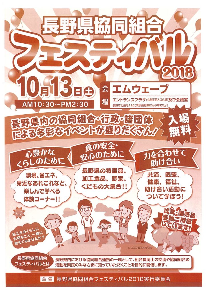 長野県協同組合フェスティバル2018 長野県内における協同組合連携の一環として、組合員同士の交流や協同組合の活動を県民のみなさまに知っていただくことを目的に開催します。 長野県内の協同組合・行政・諸団体による多彩なイベントが盛りだくさん! 入場... -
