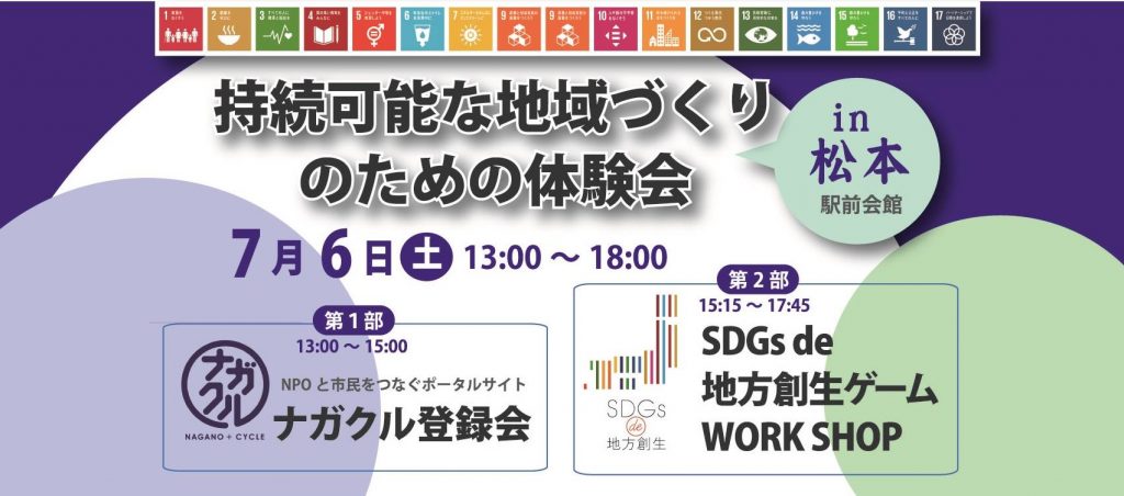 松本で「持続可能な地域づくりのための体験会」を開催します! https://nagacle.net/topics-1534/ 持続可能なまちづくりのキーワードとして、「SDGs( エスディージーズ/ 持続可能な開発目標)」が注目度を増しています。第1部では、県下初の地域課題×NPOの... -