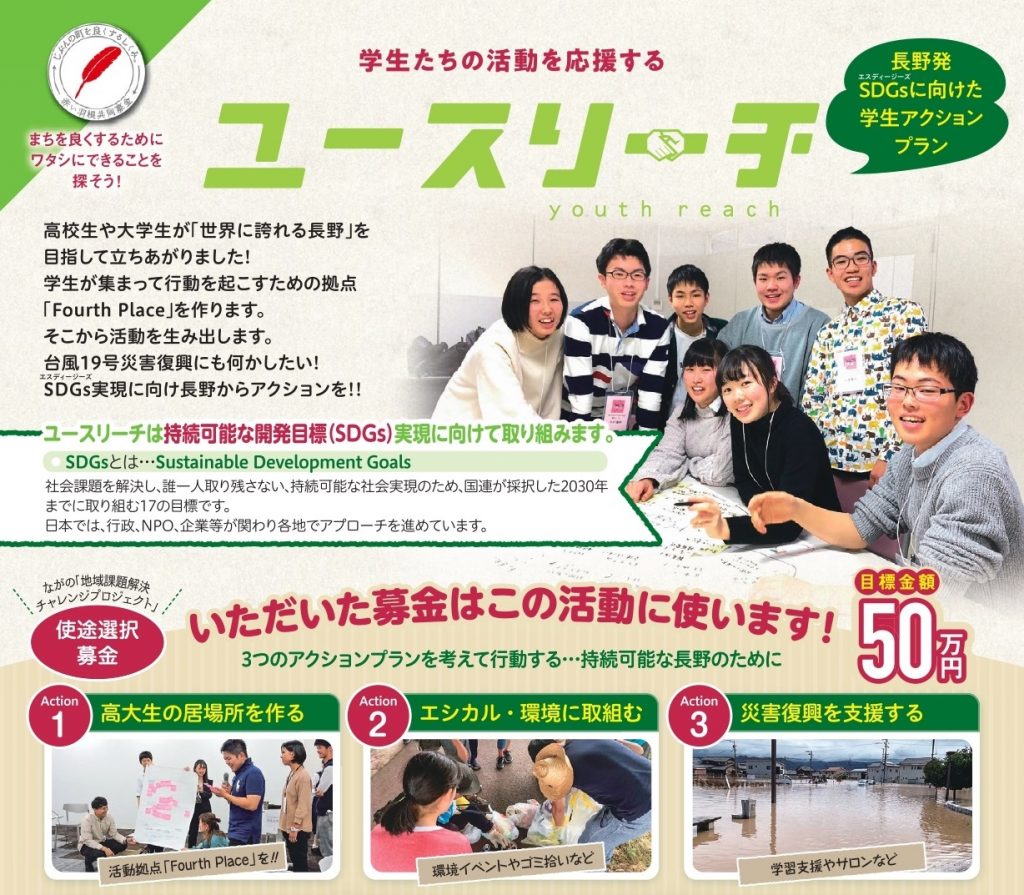2019年度も「ユースリーチ」で高校生、大学生が「ながの」を良くする活動を進めていくために、1月1日から3月31日まで募金キャンペーンを行っています!! 目標金額は110万円。赤い羽根共同募金様とのコラボレーションです。 SDGs(国連が定め...