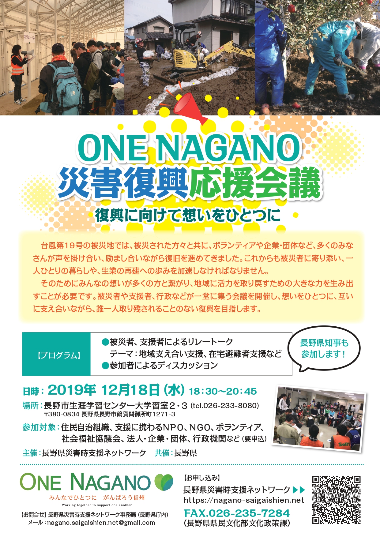 ONE NAGANO 災害復興応援会議 ~復興に向けて想いをひとつに~ を開催し、想いをひとつに、互いに支え合いながら、誰一人取り残されることのない復興を目指します。