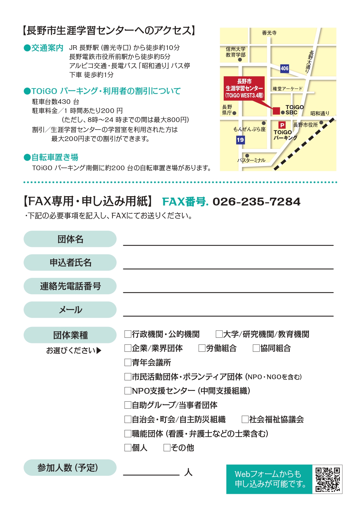 ▼場所 長野市生涯学習センター 大学習室2・3 〒380-0834 長野市大字鶴賀問御所町1271-3(TOiGO WEST 3・4階)
