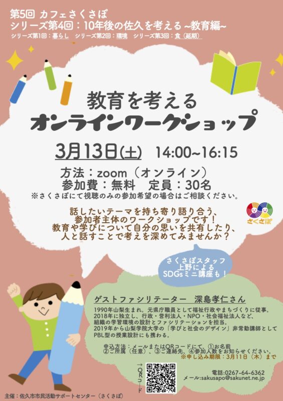 【終了】カフェさくさぽ 10年後の佐久を考える〜教育編〜 2021 3/10 インフォメーション NPO オンライン 佐久 学び 市民活動 情報 長野 2021年3月10日2021年6月17日 教育や学びについて自分の思いを共有し、人と話すことで考えを深めるオンラインワークショップです。 3月13日(土)14:00~16:15、Zoom使用、参加無料。詳しくは、さくさぽのホームページからご確認ください。申込フォームもあります。 さくさぽ カフェさくさぽ 10年後の佐久を考える〜教育編〜 | さくさぽ ☆教育を考えるオンラインワークショップ☆ 今回のカフェさくさぽは、話したいテーマを持ち寄り語り合う、 […] インフォメーション NPO オンライン 佐久 学び 市民活動 情報 長野 よかったらシェアしてね! URLをコピーしました! 【終了】カードゲームで学ぶSDGs 【終了】令和3年度 いきいき中高年 社会貢献活動支援助成金 関連記事 みんなで100年先も暮らしたい長野県にしよう!~150人の仲間(マンスリーサポーター・賛助会員)を募集します!~ 2025年11月28日 【お知らせ】複合機等寄贈プログラム(PC、モニタ、Webカメラ、テンキーもあります)ご案内 2025年10月30日 【参加募集】大人の発達障がい当事者会・カノンの会交流会 2025年10月10日 【助成金情報】環境再生保全機構・地球環境基金のご案内 2025年10月8日 【参加募集】一人でも多すぎる~性暴力を許さず、明るい未来へ~ 2025年10月7日 【参加募集】第55回長野県消費者大会のお知らせ 2025年10月7日 【案内】車いすで秋の戸隠を遊ぶイベント 2025年10月3日 【案内】秋の音楽鑑賞会と「もみじ寄席」 2025年10月3日