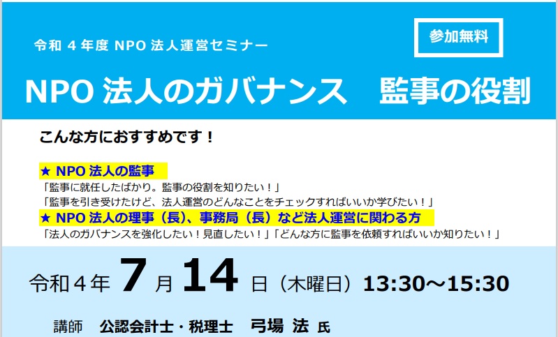NPO法人の運営力向上に向け、長野県県民協働課が主催するオンライン・セミナーです。NPO法人の監事の方や理事(長)や事務局(長)など法人運営に関わる方を主な対象に、NPO法人の監事の役割について、専門家が解説します。 日時は、令和4年7月14日(木... -