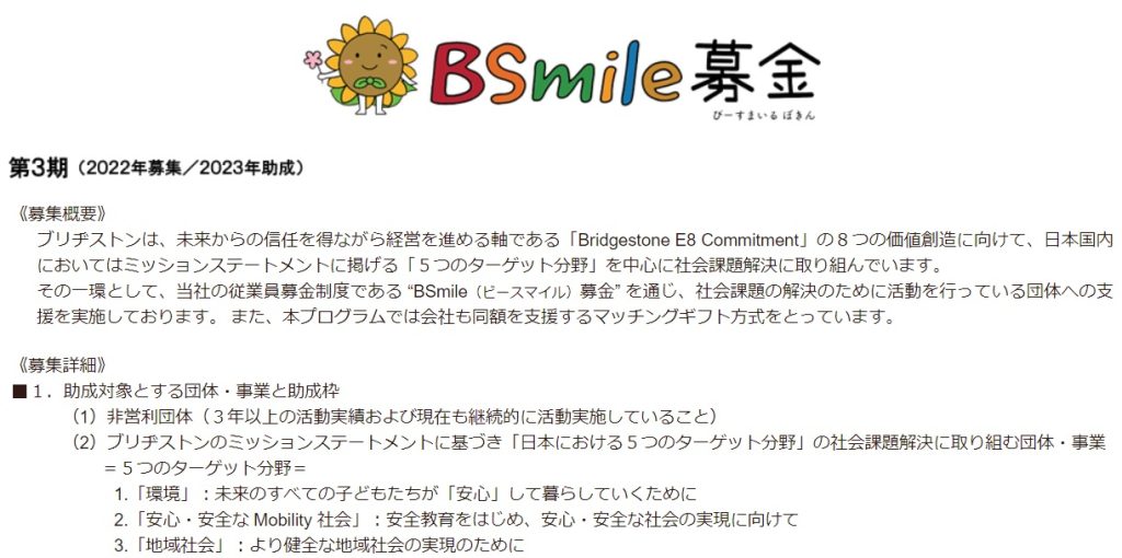 ブリヂストンは、従業員募金制度である “BSmile(ビースマイル)募金” を通じ、社会課題の解決のために活動を行っている団体への支援を実施しています。 助成対象団体は、非営利団体(3年以上の活動実績および現在も継続的に活動実施していること)と、ブ... -