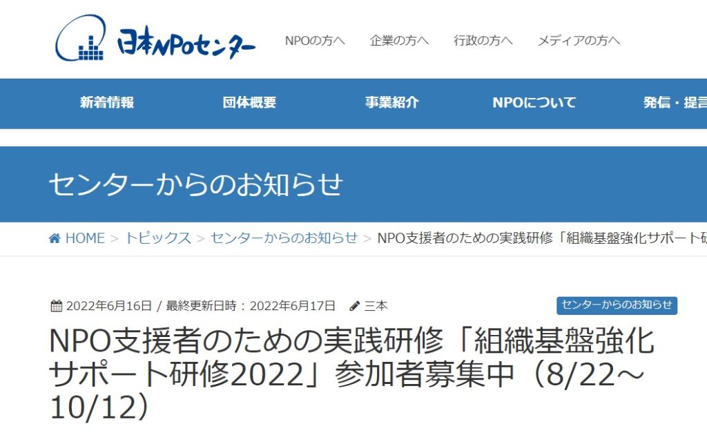 【催し案内】NPO支援者のための実践研修「組織基盤強化サポート研修2022」
