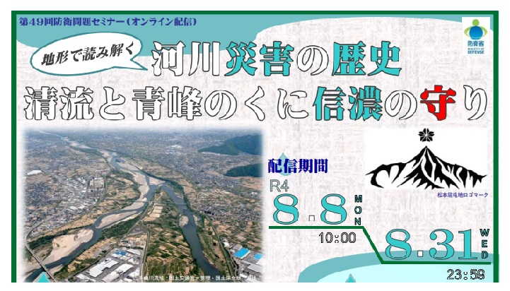 「地形で読み解く河川災害の歴史 清流と青峰のくに信濃の守り」をテーマに、北関東防衛局第49回防衛問題セミナーがオンライン配信されます。 事前の申し込み不要で、配信期間内はYouTubeチャンネルで視聴できます。 配信日時は2022年8月8日(月)10:00... -