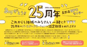 来年の2024年4月に長野県NPOセンターが設立25周年を迎えるにあたり、認定NPO法人の取得を目指してバースデードネーションに挑戦します。