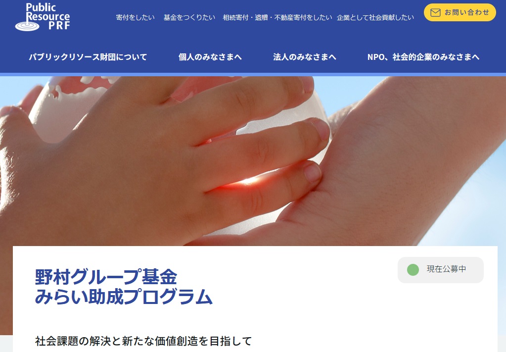 パブリックリソース財団は、社会課題の解決と新たな価値創造を目指し、先駆的でイノベーティブ(革新的)な取り組みや他のモデルとなりうる取り組みに対して資金支援を行う「野村グループ基金 みらい助成プログラム」(2024年度)を公募しています。 ◇対象... -
