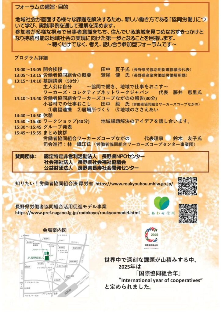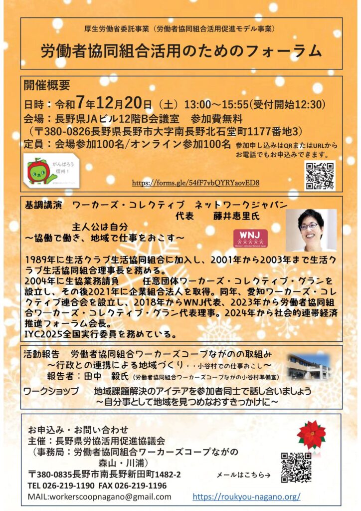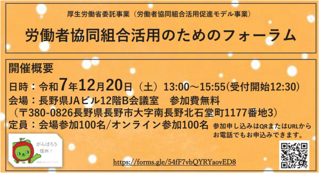 12月20日(土)に長野市にて「労働者協同組合活用のためのフォーラム」を開催します。