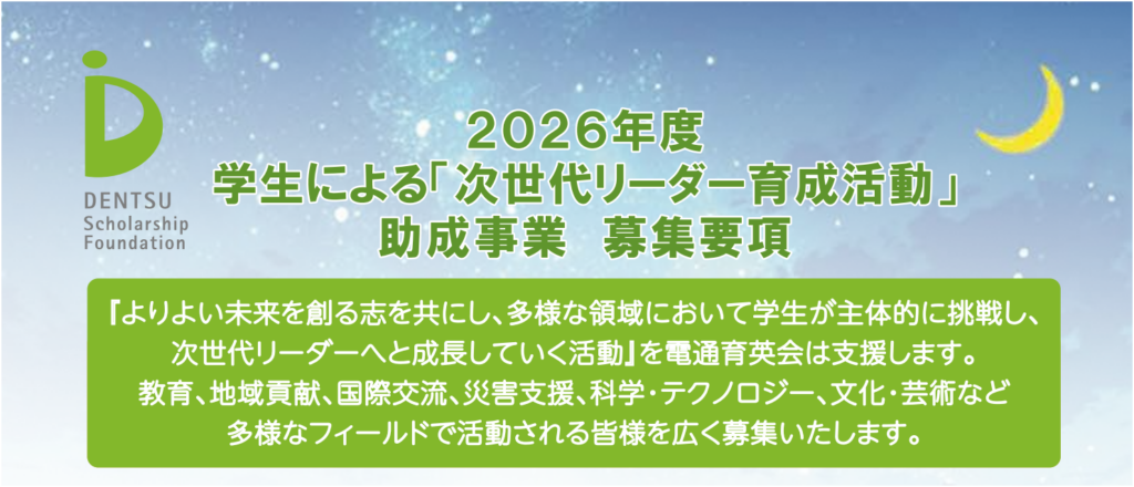 公益財団法人 電通育英会は、「社会を牽引する人材を育成すること」を目的として、1963年3月に財団法人として設立され、大学生・大学院生への奨学金給付事業を中心に、様々な事業を展開しております。そして、あらゆる社会課題に向き合う人材の育成を、さらに一歩進めるための事業として、大学生を中心とする学生を対象とした人材育成に取り組む学生団体やNPO法人等の活動に対する助成事業を行っています。