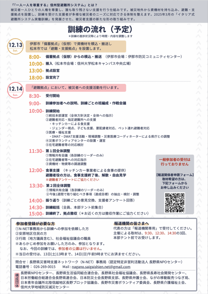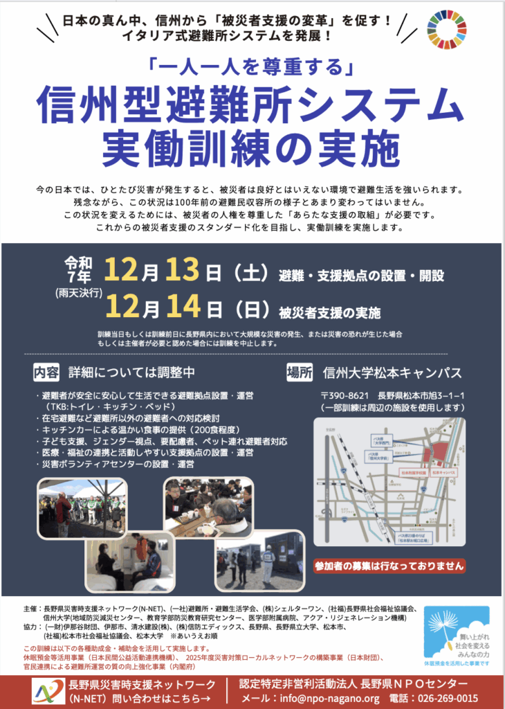 長野県災害時支援ネットワーク(N-NET)は関係各者とともに、来たる12月13-14日に信州型避難所システム実働訓練を実施いたします。本訓練では、災害時、すべての被災者が人として尊重され、誰ひとり取り残さない支援を目指します。