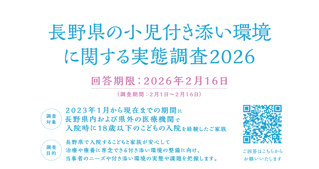 調査目的:長野県で入院するこどもと家族が安心して治療や療養に専念できる付き添い環境の整備に向け、事者のニーズや付き添い環境の実態や課題を把握します。