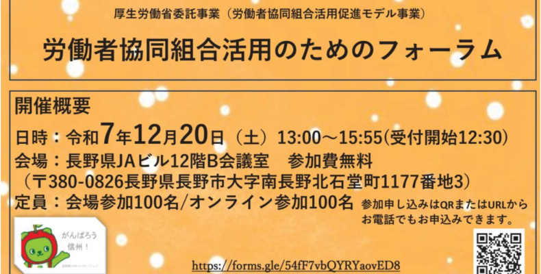 12月20日(土)に長野市にて「労働者協同組合活用のためのフォーラム」を開催します。詳細は下記チラシ…