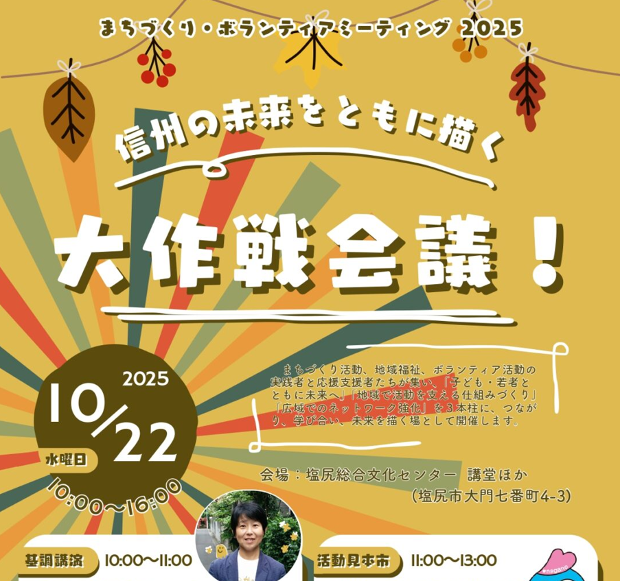 市民活動団体や地域福祉推進者・共同募金関係者など、まちづくり活動、地域福祉、ボランティア活動の実践者と応援者たちが集い、「こども・若者と共に未来へ」「地域で活動を支える仕組みづくり」「広域でのネットワーク強化」を3本柱に、つながり、学び合い、未来を共に描き出す場として開催します。 ○ 日 時 令和7年10月22日(水)10:00~16:00○ 会 場 塩尻総合文化センター 講堂ほか(塩尻市大門七番町4-3)○ 主な内容 ・ 基調講演「子どもの居場所づくりは多世代がつながるまちづくり」 ... -