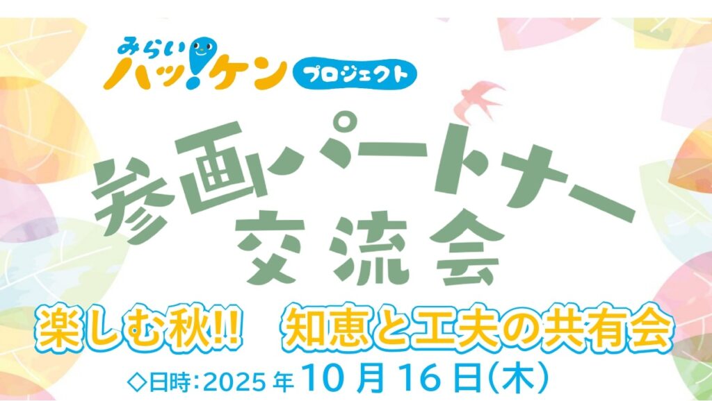 みらいハッ!ケンプロジェクト 参画パートナー交流会 「楽しむ秋 知恵と工夫の共有会」 長野市で実施されている子どもの体験機会を提供する「みらいハッケンプロジェクト」。多くの参画パートナーがプログラムを提供しています。が、うまくいかなかったり?すごくうまくいっていたり?子どもたちに楽しみながら大切な体験をしてもらうためにみなさん工夫していることがあると思います。それを共有して、できるだけたくさんの子どもにポイントを使ってもらえるように!!を一緒に考えませんか? 当日は、主催者側か... -