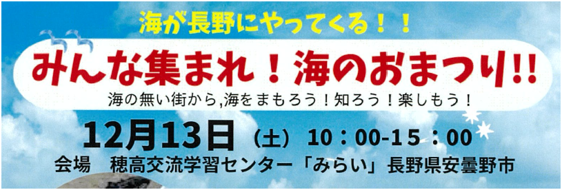 【日時】12/13(土)10:00-15:00【会場】安曇野市 穂高交流学習センター「みらい」【参加費】無料【内容】下記PDFをご参照ください【主催】信州継美隊・NPO法人湘南クリーンエイドフォーラム【協力】海と日本プロジェクト in 長野、プロギング信州 -