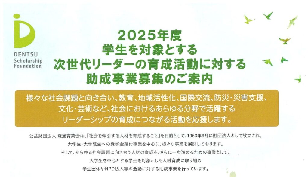 【助成金情報】2025年度 学生を対象とする次世代リーダーの育成活動に対する助成事業募集/電通育英会