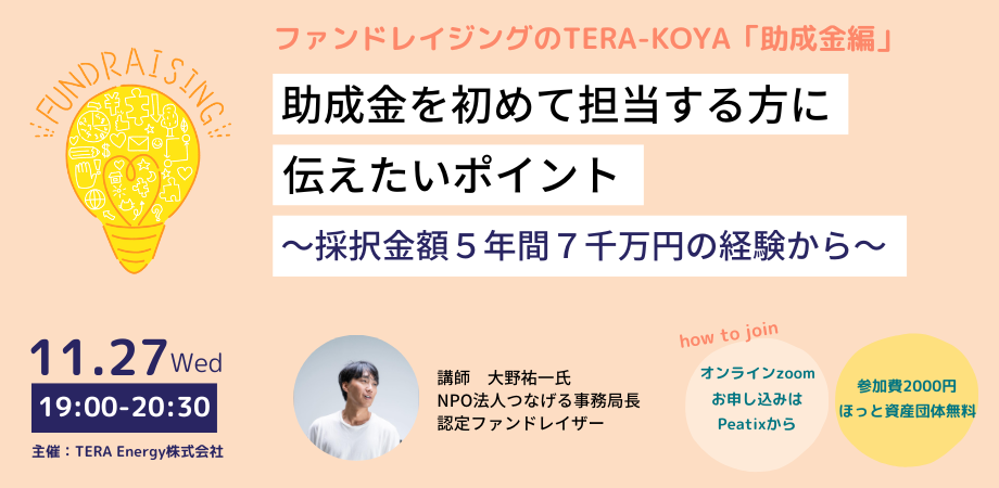 【参加者募集】「ファンドレイジングのTERA-KOYA <助成金編>「助成金を初めて担当する方に伝えたいポイント」〜採択金額5年間7千万円の経験から〜」