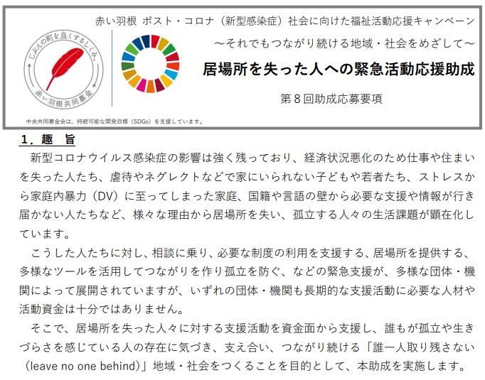 社会福祉法人中央共同募金会は、居場所を失った人々に対する支援活動を資金面から支援し、誰もが孤立や生きづらさを感じている人の存在に気づき、支え合い、つながり続ける「誰一人取り残さない(leave no one behind)」地域・社会をつくることを目的とし... -