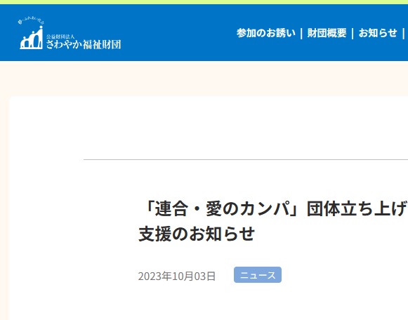 公益財団法人さわやか福祉財団は、日本労働組合総連合会(連合)「連合・愛のカンパ」の資金を用いて、地域の住民主体による生活支援等の助け合い団体立ち上げや新規事業開始を支援するための助成を行ないます。 ◆助成対象:2022年10月以降に設立された団... -