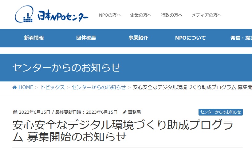 特定非営利活動法人日本NPO センターはTIS株式会社からの寄付を受け、安心安全なデジタル社会を実現することを目的に、社会的脆弱性のある人々をデジタル被害から守り、技術活用を通じたエンパワメントを促進する多様なNPOの活動を助成します。 1.対象プ...