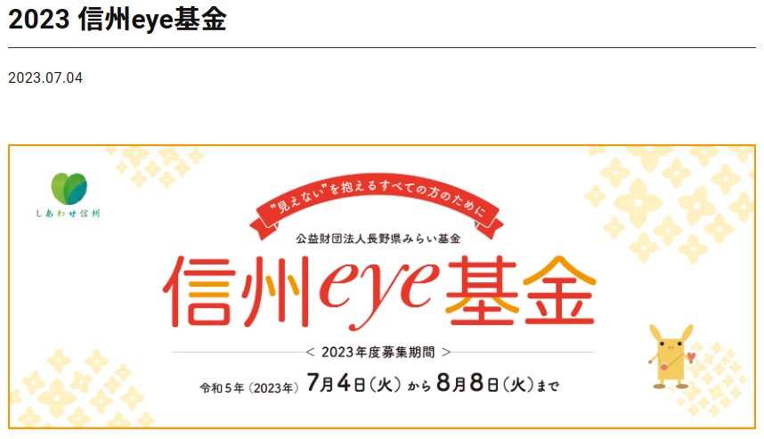 公益財団法人長野県みらい基金は、2021年度に設立した「信州eye(アイ)基金」を原資に、遺贈寄付者のご意思に基づき、県内の視覚障がい者の学びや暮らしを応援する非営利の民間団体の活動を助成します。 ◇助成対象団体長野県内を事業拠点とした、特定非営... -