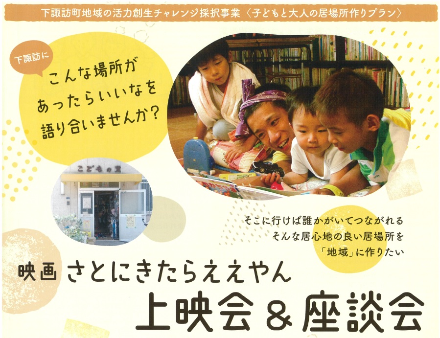 しもすわ居場所作り隊は、人情が色濃く残る街の人々の奮闘を描く、涙と笑いあふれるドキュメンタリー映画「さとにきたらええやん」上映会&座談会を、下諏訪総合文化センターで開きます。 映画を観て「こんな場所があったらいいな」を語り合いませんか? ... -