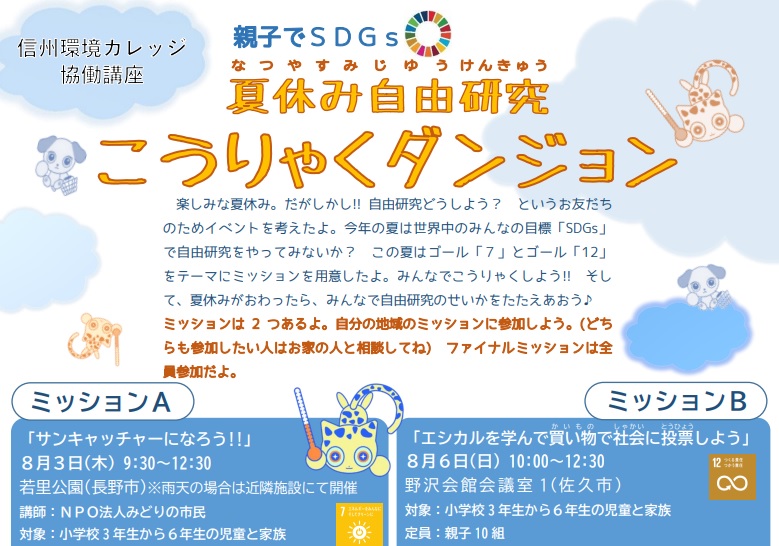 夏休みの自由研究向けに、親子で参加できるSDGsミッションを長野市と佐久市で開催します。 対象は、小学校3年生から6年生の児童と家族。ご自分の「地域のミッション」と「ファイナルミッション」にご参加ください。 ◇ミッションA「サンキャッチャーになろ... -