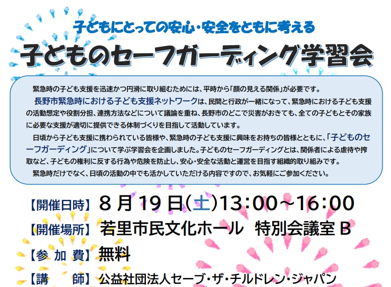 どこで災害がおきても、全ての子どもとその家族に必要な支援が適切に提供できる体制づくりを目指して活動している「長野市緊急時における子ども支援ネットワーク」は、日頃から子ども支援に携わられている皆様や、緊急時の子ども支援に興味をお持ちの皆様... -