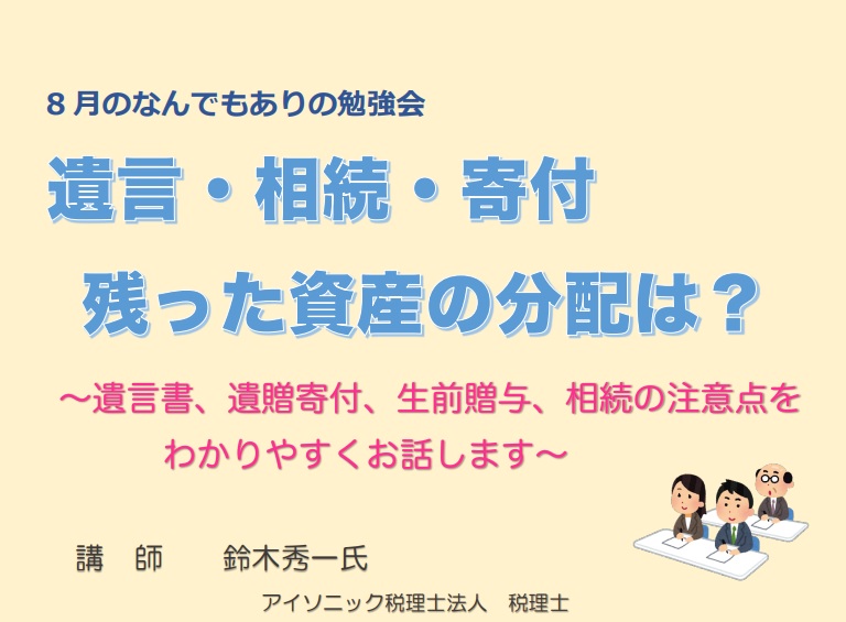 NPO法人ライフデザインセンターは、なんでもありの勉強会「遺言・相続・寄付 残った資産の分配は? ~遺言書、遺贈寄付、生前贈与、相続の注意点をわかりやすくお話します~」を開催します。 ◇日 時 2023年8月24日(木)13:30~15:30 ◇場 所 長... -