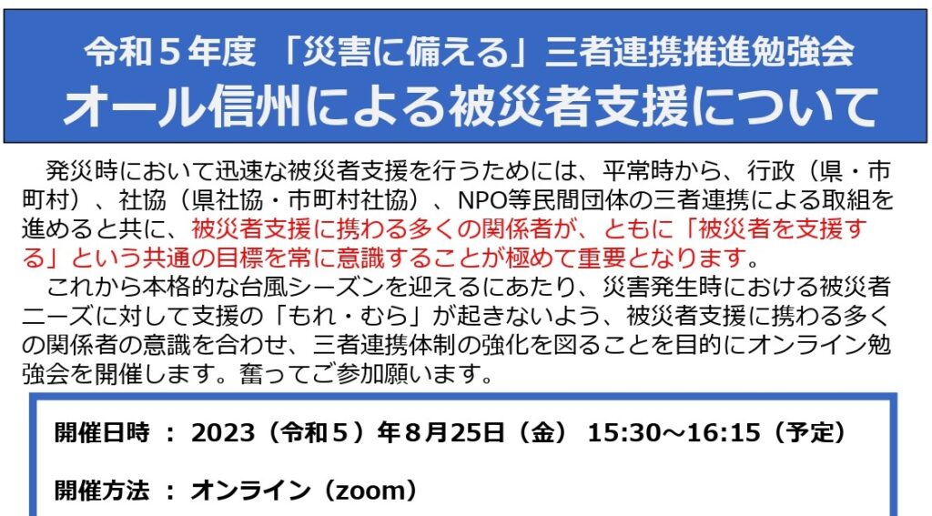 【参加募集】「災害に備える」三者連携推進勉強会 オール信州による被災者支援について