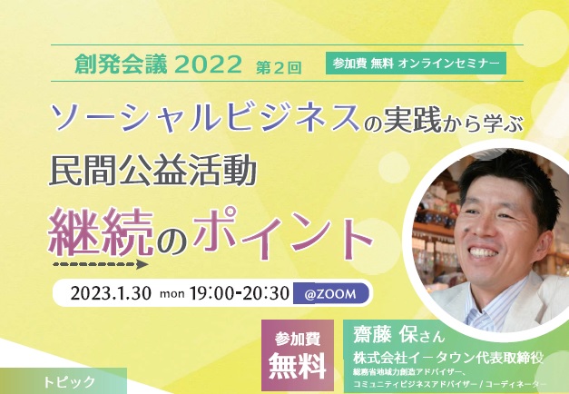 一般財団法人中部圏地域創造ファンドは1月30日(月)、ZOOMによるオンラインで「ソーシャルビジネスの実践から学ぶ民間公益活動継続のポイント」を開催します。 先駆的にソーシャルビジネスに取り組み、多彩なビジネス展開とコミュニティカフェの運営を通... -