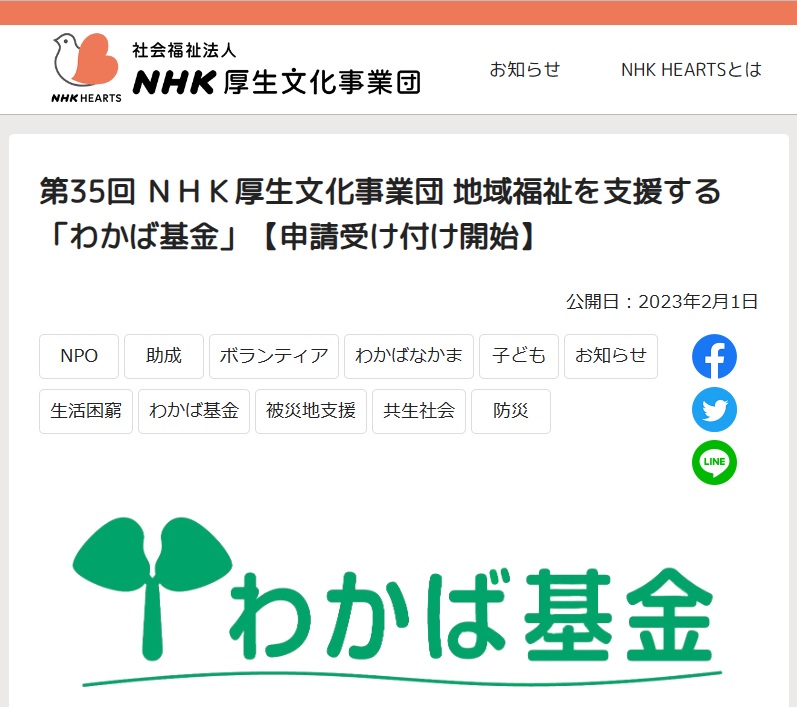社会福祉法人NHK厚生文化事業団は、地域に根ざした福祉活動を進めているグループを支援する「わかば基金」の申請を3月29日まで受け付けています。 基金には、①より活動を広げたいグループを対象とする「支援金部門」(最高100万円)、②自然災害の被災地の... -