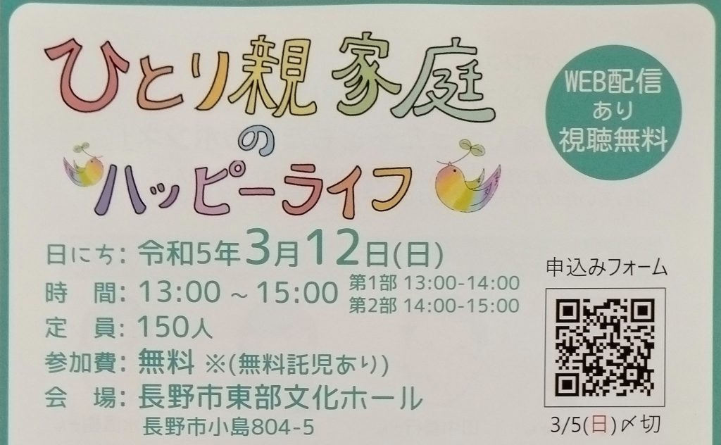 NPO法人HappySpotClubは3月12日(日)、長野市東部文化ホールで「ひとり親家庭のハッピーライフ」を開きます。参加は無料で、WEB配信も視聴無料です。 第1部は講演会「ひとり親~抱える不安との向き合い方~」をテーマに、長野県NPOセンターの石坂みどり(... -