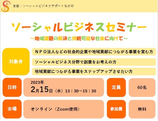 ソーシャルビジネスサポートながのは2月15日(水)13:30~15:30、オンラインで「ソーシャルビジネスセミナー~地域課題の解決と持続可能な社会に向けて~」を開きます。 参加費は無料で、どなたでもご参加いただけます。特に「NPO法人などの社会的企業や地... -