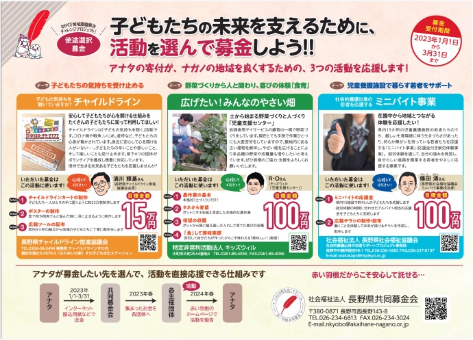 社会福祉法人長野県共同募金会は、地域課題・社会課題の解決に取り組む団体を応援し、「つながりをたやさない社会づくり」を進めることを目的として、共同募金運動期間の1月から3月までの3か月間、使途選択募金(ながの「地域課題解決チャレンジプロジェ... -