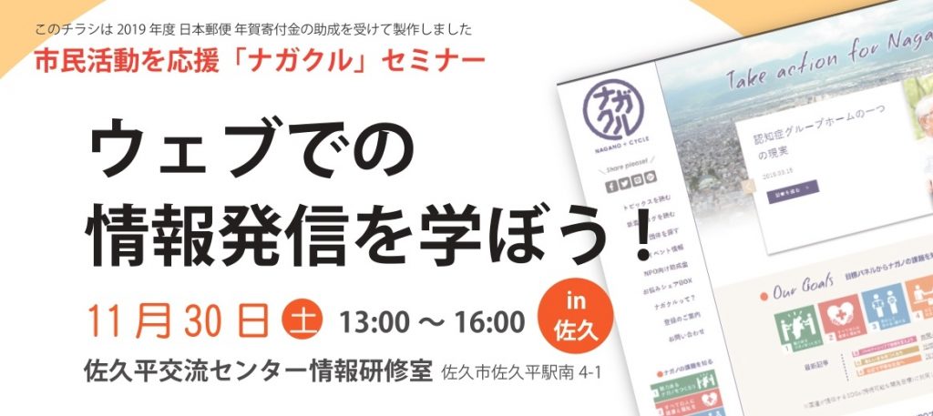 申し込みは⇒ https://formcreator.jp/answer.php?key=Lnz2KbcZbr6SbpP7PAJWeg%3D%3D 市民活動を応援「ナガクル」セミナー ウェブでの 情報発信を学ぼう! in 佐久 11月30日(土)13:00~16:00 佐久平交流センター情報研修室(佐久市佐久平駅南4-1) ブログ... -