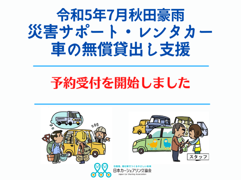 日本カーシェアリング協会は、秋田豪雨で車を被災された方へ車の無料貸し出し支援を開始しました。 <支援概要> ◇無料貸出期間:2023年7月31日~12月20日 ◇貸出形態: ●長期貸出 [車種:普通乗用・軽乗用] 期間:最長2週間 ●短期貸出 [車種:軽... -