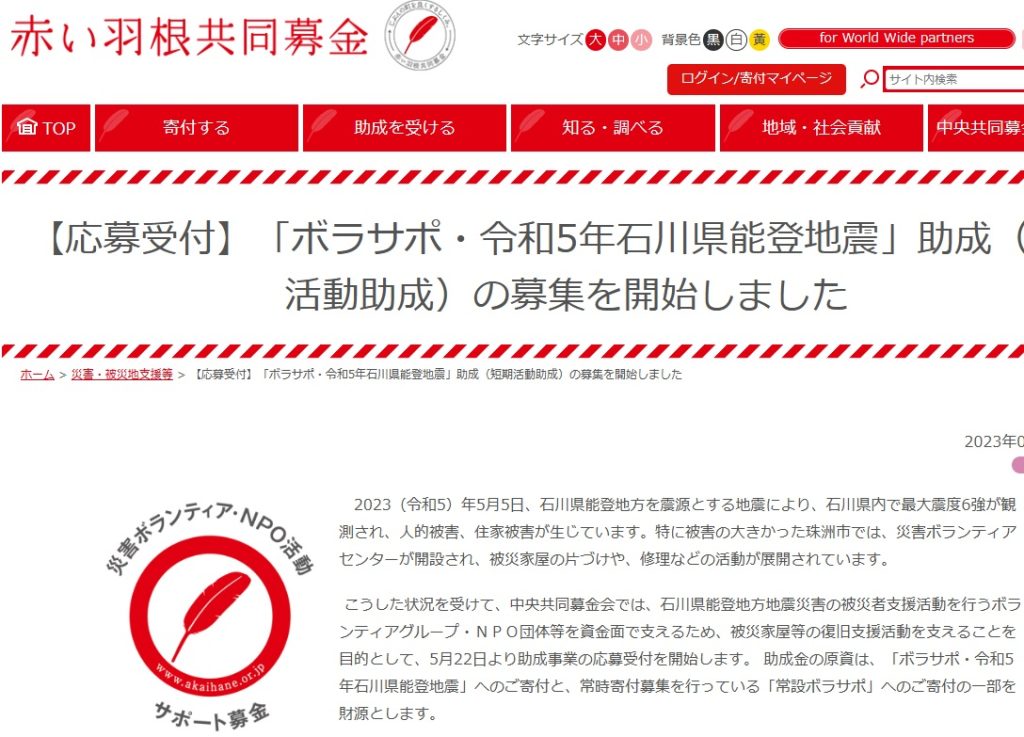 中央共同募金会では、石川県能登地方を震源とする地震によって被害を受けた被災者支援活動を行うボランティアグループ・NPO団体等を資金面で支えるため、「ボラサポ・令和5年石川県能登地震」の寄付を募集し、その一部を財源とする助成事業の応募受付を... -