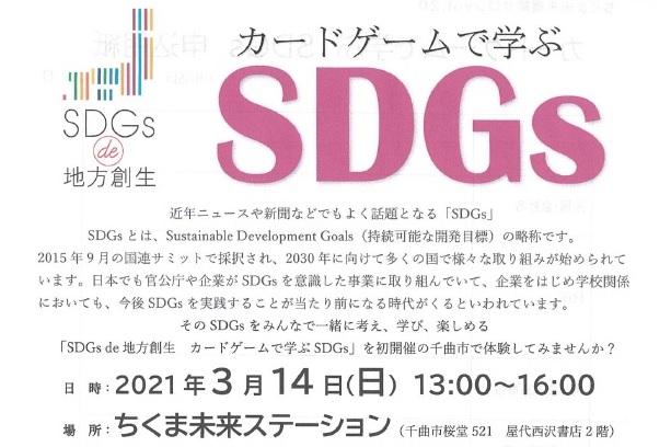 3月14日(日)、ちくま未来ステーション(長野県千曲市桜堂521屋代西沢書店2階)で「SDGs de 地方創生 カードゲームで学ぶSDGs」が開かれます。ファシリテーターは、長野県NPOセンターの小林達矢事務局次長が務めます。詳しくは、ちらしをご覧ください。 -