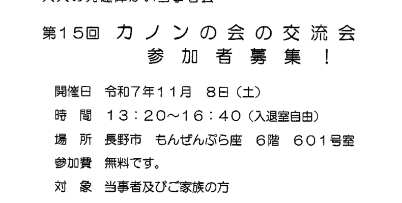 【参加募集】大人の発達障がい当事者会・カノンの会交流会 2025年10月10日Category: インフォメーション | 参加募集 大人の発達障がい当事者会「カノンの会」は、参加者が日頃思っていること、感じていること、悩みや趣味など… read more