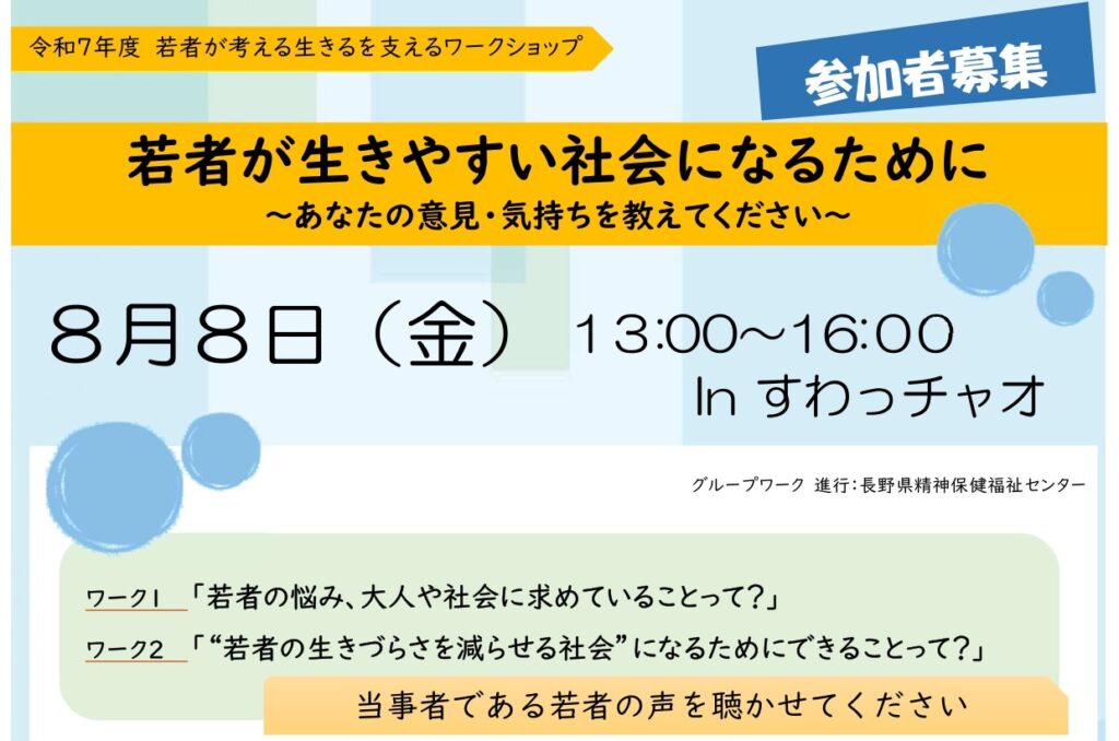 長野県では,子ども・若者の自殺対策事業を推進するにあたり,諏訪圏域在住及び諏訪圏域の高等学校等に通学する高校生,大学生,フリースクール在籍生等に集まっていただき,子ども・若者の自殺対策に関する意見交換を行うことで,若者世代の意見を取り... -