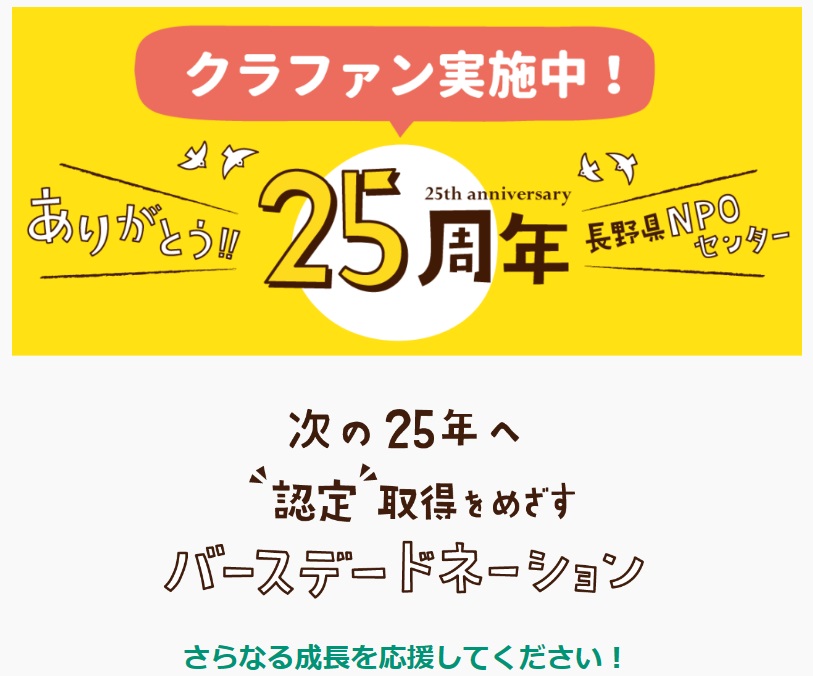ありがとう!! 25周年これからも地域のみなさんと一緒に!!25周年のバースデードネーションで認定取得をめざします!! *クラウドファンディングは終了しました。たくさんのご協力とご支援をありがとうございました。 11月1日、本日から12月31日まで、長野...